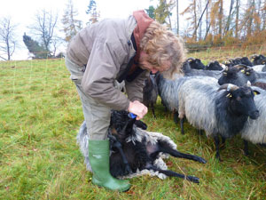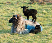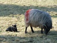 Im zeitigen Frühjahr werden die Mutterschafe auf ihre große Ablammweide im Nationalpark gebracht. Die Lammzeit ist die schönste Zeit im Jahr, wenn alles klappt und alle Lämmer angenommen werden, ist aber auch sehr anstrengend, da man die lammende Herde am besten gar nicht aus den Augen läßt damit man bei selten auftretenden Komplikationen eingreifen kann. Ein weiterer Faktor sind die Kolkraben, die für die schwächeren Lämmer und ablammende Muttern schnell eine ernsthafte Gefahr darstellen können, vor allem wenn Nachgeburten nicht penibel entsorgt werden. Direkt nach dem Ablammen werden bei den Mutterschafen die Euter kontrolliert und die Klauen geschnitten, anschließend werden alle anhand der Ohrmarkenummern notiert und markiert um sie zur Schafschur sortieren zu können.